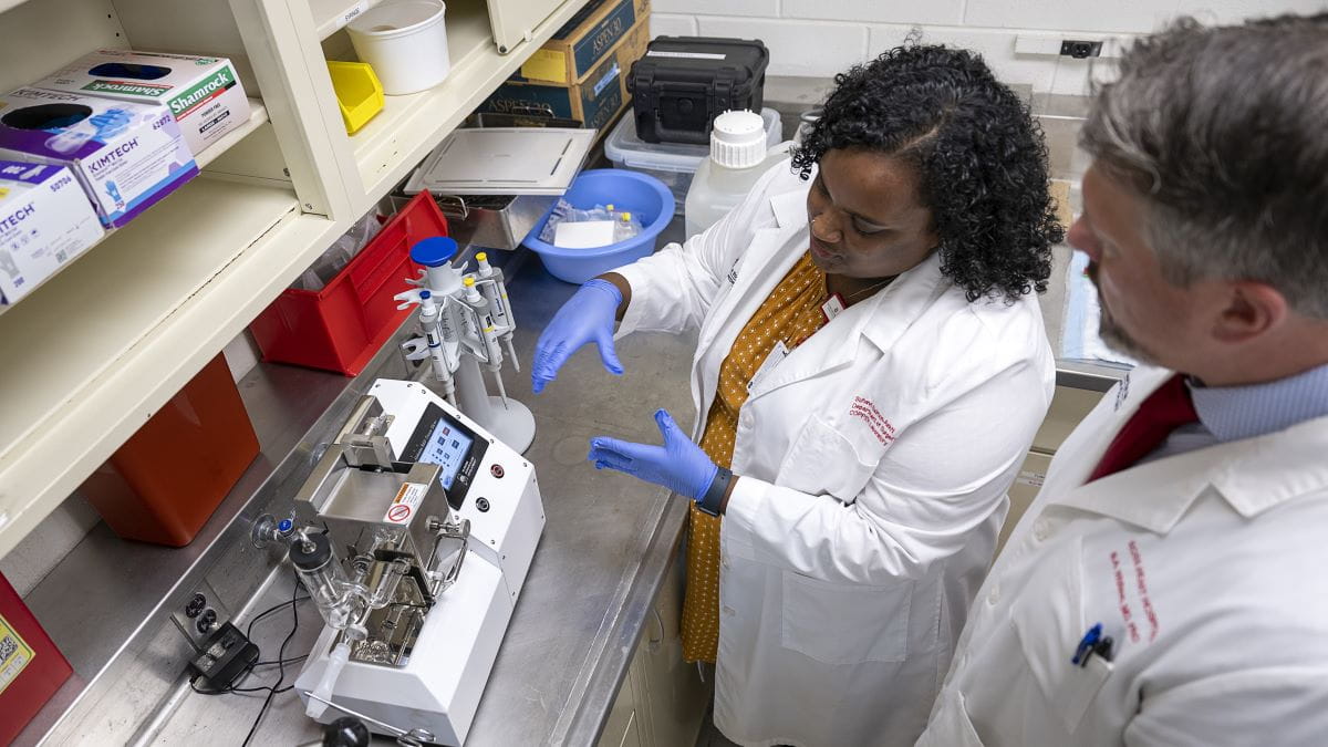 Mahmood Khan, MPharm, PhD, and team have developed a biodegradable nanofiber “patch” seeded with stem cells that beat like healthy heart cells. When applied to the heart after heart attack, the patch enhances the retention and survival of transplanted stem cells. Cell death is the greatest impediment to stem cell-based therapies. Next step: in-human trials given success in preclinical large animal models.